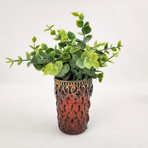 Vasinho Castical Rubi Bronze 10X7X7Cm Vaso Decoracao Uso: este lindo Castiçal, da Inigual Decor, nos tons Rubi e bronze feito em vidro e detalhes em metal vão deixar seu ambiente muito aconchegante com a decoração romântica e ao mesmo tempo funcional. Essa peça é muito versátil, pois pode ser Utilizado como castiçal mas também como vaso decorativo colocando uma planta artificial. Assim terá 2 composições para uma mesma peça Medidas: Altura: 10cm / largura: 7cm / profundidade: 7cm / peso: 170g Material: Vidro e ferro Conteúdo da embalagem: 1 castiçal vaso Atenção Obs. as plantas e folhagens não estão incluídas no anúncio, são meramente ilustrativas.