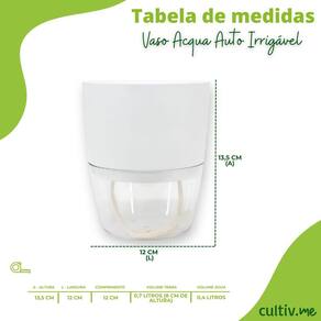 Características Largura: 12 cm Altura total: 13,5 cm Boca: 12 cm Base: 12 cm Volume terra: 0,7 litros (8 cm de altura) Volume água: 0,4 litros Peso: 0,120 gramas Material: Plástico Polipropileno Marca: Vasart Ambientes: Interno e externo