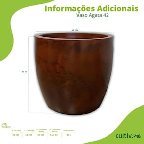 Vaso Agata 42 (33L) Cor Aço Corten JAPI Descrição * O vaso Ágata 42 é inspirado na beleza natural da pedra preciosa Ágata. * Seu acabamento brilhante e cores exclusivas remetem às veias e tons da pedra, criando um visual sofisticado e único. * Ideal para composições harmônicas ou ousadas, valorizando qualquer planta. * Combina elegância, qualidade e originalidade, sendo perfeito para ambientes internos e externos. * Versátil, pode ser utilizado em salas, varandas, jardins e áreas gourmet.