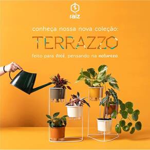 O que um dia era lixo agora virou a nova casa de sua planta. A coleção Terrazzo foi feita para você, pensando na natureza. A paleta de quatro tons terrosos com detalhes em fibra de madeira são o match de praticidade e sustentabilidade. O Sistema Autoirrigável e antidengue exclusivo da Raiz com a nova seleção de cores permite infinitas composições e proporcionam facilidade em combinar diferentes materiais, texturas entre diferentes plantas e objetos do seu décor.
