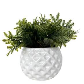 Decoração enfeite sala rack estante vaso cachepot branco de cerâmica com textura gométrica trabalhado 3D com arranjo planta artificial.