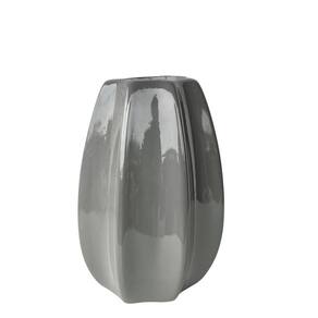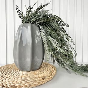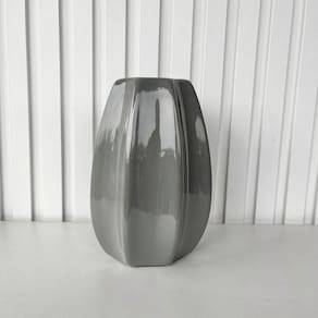 Decoração sala rack aparador vaso centro de mesa médio de cerâmica moderno trabalhado alto relevo na cor cinza decoração luxo com arranjo planta artificial.