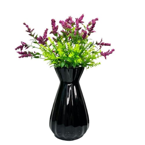 Vaso centro de mesa preto alto brilho de cerâmica moderno com arranjo floral estilo lavanda.