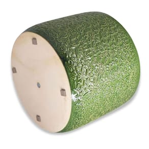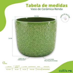 Característica * Tipo: Vaso de cerâmica esmaltado * Modelo: Renda (15) * Cor: Verde Cobre * Altura: 14 cm * Largura superior (boca): 17,3 cm * Largura da base: 16 cm * Material: Cerâmica artesanal esmaltada * Acabamento: Brilhante com textura rendada * Furo de drenagem: Sim * EVA protetor de base: Sim * Tampa para Furo de Base Sim * Produção: Artesanal * Indicado para: Plantas naturais e artificiais, decoração interna e externa