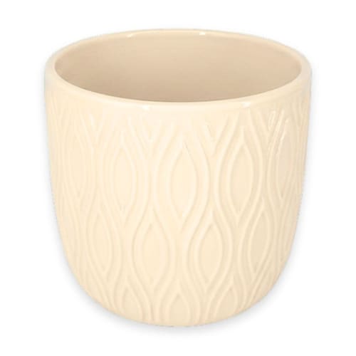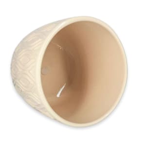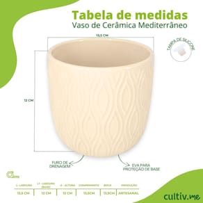 Característica * Tipo: Vaso de cerâmica esmaltado * Modelo: Mediterrâneo (12) * Cor: Off White * Altura: 12 cm * Largura superior (boca): 13,5 cm * Largura da base: 12 cm * Material: Cerâmica artesanal esmaltada * Acabamento: Brilhante com textura mediterrânea * Furo de drenagem: Sim * EVA protetor de base: Sim * Tampa para furo de base: Sim * Produção: Artesanal * Indicado para: Plantas naturais e artificiais; decoração interna e externa