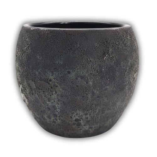 Característica *Material: Cerâmica Esmaltada * Cor:Rocha Vulcânica * Altura: 12,5 cm * Diâmetro superior (boca): 12,6 cm * Largura total: 14,5 cm * Base: 9,5 cm * Furo de drenagem: Sim * Acabamento: Texturizado * Produção: Artesanal * Indicado para Pote 12