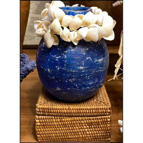 Vaso de barro confeccionado à mão na cor azul, ornamentado com colar de conchinhas.