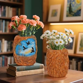 Material: resina Peso: 450 g Tamanho: 19 x 18,5 x 22 cm Design inspirado na arte de Van Gogh — Vaso de flores exclusivo com um céu estrelado e pássaros voando sobre um campo de trigo, adicionando um toque artístico e elegante a qualquer espaço. Material de resina durável — Feito de resina de alta qualidade, leve e resistente, resistente ao desbotamento, adequado para uso interno e externo de longo prazo. Ideal para suculentas e expositores florais — Perfeito para suculentas, ervas, cactos ou arranjos de flores, criando uma exibição de plantas vibrante e criativa. Acento decorativo versátil — Adequado para decoração de sala de estar, mesa, varanda, pátio ou jardim, combinando funcionalidade com estilo artístico. Dimensões do produto — mede 19 x 18,5 x 22 cm, pesa 450 g; tamanho prático para colocação de mesas, parapeitos de janelas ou entradas, aprimorando a decoração moderna da casa.