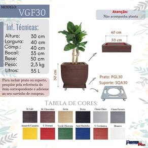 Anúncio válido para 1 um vaso quadrado de resina de polietileno para plantas naturais e artificiais. Não acompanha prato, plantas e nem suporte.Vaso com largura maior para plantas de pequeno a médio porte, que necessitam de espaço para desenvolvimento. Destaca-se pela delicadeza e leveza, ideal para decoração, o design e a textura oferecem elegância e beleza, transformando seu ambiente.Modelo VGF30Medidas técnicas:Altura: 30 cm; largura: 40 cm; Comp: 40 cm; base: 30 cm; peso: 2,2 kg / 35 lGrandes vantagens do polietilenoGrande durabilidade, resistência e leveza;Podem ficar expostos ao sol, chuva, poeira e maresias;Podem ser mantidos em contato permanente com o solo;Impermeáveis e laváveis;Não proliferam fungos e bactérias;Não mofam e não ressecam; Não soltam farpas ou rachaduras;Não desbotam;Não necessitam de manutenção;Possuem proteção contra raios ultra-violeta uv ;Duram mais que concreto, cerâmica, fibra e outros;