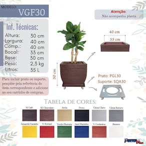 Anúncio válido para 1 um vaso quadrado de resina de polietileno para plantas naturais e artificiais. Não acompanha prato, plantas e nem suporte.Vaso com largura maior para plantas de pequeno a médio porte, que necessitam de espaço para desenvolvimento. Destaca-se pela delicadeza e leveza, ideal para decoração, o design e a textura oferecem elegância e beleza, transformando seu ambiente.Modelo VGF30Medidas técnicas:Altura: 30 cm; largura: 40 cm; Comp: 40 cm; base: 30 cm; peso: 2,2 kg / 35 lGrandes vantagens do polietilenoGrande durabilidade, resistência e leveza;Podem ficar expostos ao sol, chuva, poeira e maresias;Podem ser mantidos em contato permanente com o solo;Impermeáveis e laváveis;Não proliferam fungos e bactérias;Não mofam e não ressecam; Não soltam farpas ou rachaduras;Não desbotam;Não necessitam de manutenção;Possuem proteção contra raios ultra-violeta uv ;Duram mais que concreto, cerâmica, fibra e outros;