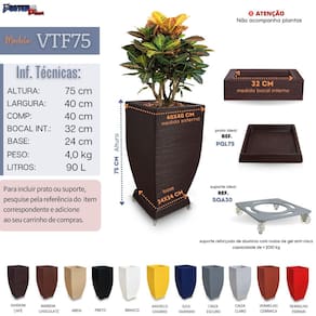 Modelo: vtf75 Altura: 75 cm Largura: 40 cm Base: 24 cm Peso: 4 kg Capacidade: 90 litros Material: polietileno ................................................................................................................................................... Grandes vantagens do polietileno
