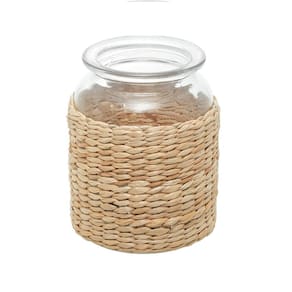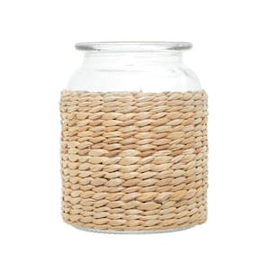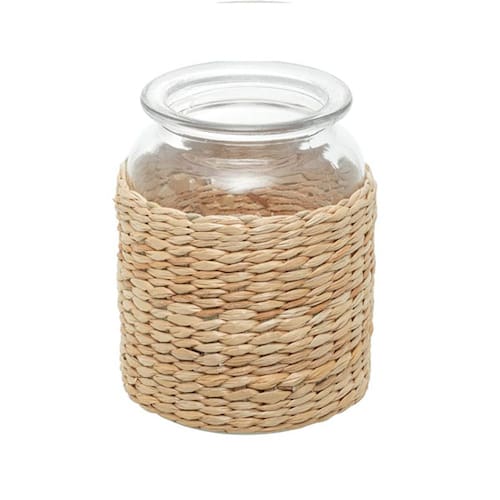 Este vaso é uma combinação perfeita entre o vidro transparente e a fibra natural, criando uma peça única que irá encantar seus olhos e adicionar um toque de rusticidade elegante aos seus ambientes.