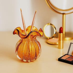 O vaso decorativo em Vidro Murano é ideal para acomodar arranjos florais, plantas de pequeno porte ou como peça de destaque individual. A técnica de produção artesanal, com vidro soprado, resulta em um objeto único, com variações sutis que atestam sua autenticidade. O acabamento translúcido âmbar permite a passagem de luz, valorizando a cor e as texturas, enquanto as bolhas internas proporcionam um efeito visual diferenciado.