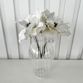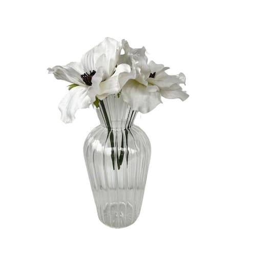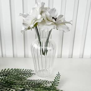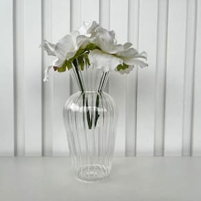 Enfeite sala decoração casa vaso de vidro transparente frisado pequeno com flor branca artificial moderna.