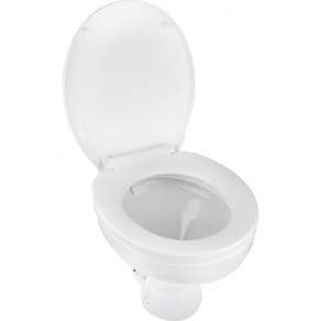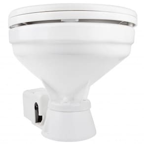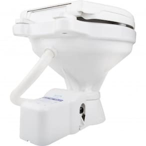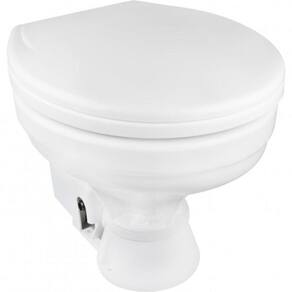 Banheiro elétrico para barco com cuba grande e tampa com fecho suave e assento de plástico. O vaso sanitário pode ser montado acima e abaixo da linha de água e possui proteção séptica integrada. Todos os parafusos de aço inoxidável e peças de metal. Vem com painel de controle e tampa do motor.