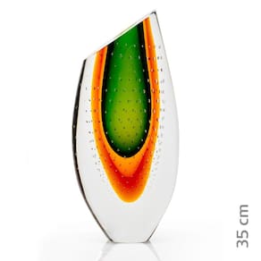 Vaso Em Cristal Murano Esmeralda E Ambar São MarcosComprimento:16cmLargura:11cmAltura:35cmPeso:6660gProduzida 100% artesanalmente com a técnica secular e originária da Itália, a qual com muita maestria e criatividade são desenvolvidas e preservadas no Brasil pela Cristais São Marcos desde 1962. As escolhas das peças são versáteis e podem ser usadas para decorar casas e ambientes dos mais variados estilos. A tradição do Cristal Murano e a inovação em detalhes, formas e cores, trazem requinte para a decoração. O colorido do Muranoem especial, tornase um coringa na decoração e produzem um efeito muito bonito em locais com luz natural, não dependendo de nenhum outro elemento para se destacar. As peças em Cristal Murano, são atemporais, aposte nelas como a estrela da decoração ou ainda para harmonizar em combinações com diferentes artigos para compor um ambiente. Junto com as peças em Murano, leve ainda um pouco de história. Uma dica é misturar diferentes Muranos e criar sua coleção de arte particular. O cristal Murano, tornouse objeto de desejo por suas caracteristicas únicas. Sendo assim, com todas essas particularidades, ele é uma ótima escolha para decorar, colecionar e ainda presentear com classe e sofisticação.