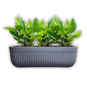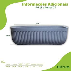 Características * Comprimento: 79cm * Largura: 31cm * Altura: 24,5cm * Boca: 71cm * Base: 64cm * Volume: 32 litros * Peso: 2470 gramas * Furo de drenagem: Sem furo * Material: Polietileno (tecnologia de rotomoldagem) * Cor: Iron * Ambientes: Interno e externo