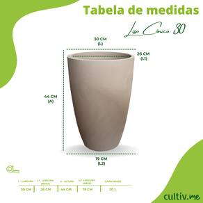 Vaso Liso Cônico 30 (20L) Macchiato JAPI Descrição * Agregam um formato moderno e super versátil, que se encaixa em inúmeros ambientes, além de expandir as possibilidades de composição da linha. * O formato cônico confere sofisticação aos ambientes, além de possibilitar o desenvolvimento de plantas com raízes mais compridas