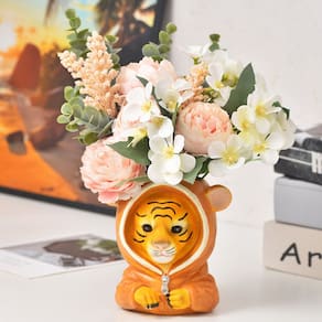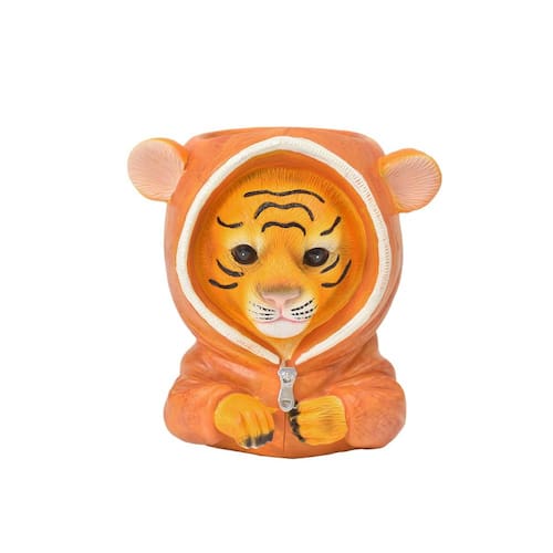 Material: resina Peso: 330 g Tamanho: 12 x 10 x 13 cm Design do capuz de tigre: atraente plantador em forma de filhote de tigre com capuz laranja, trazendo um charme divertido e criativo à sua decoração. Artesanato de resina durável: feito de resina resistente com detalhes finos, à prova d'água, resistente ao desbotamento e ideal para uso interno ou externo de longo prazo. Característica do tampão de drenagem: inclui um orifício de drenagem com tampa de borracha, garantindo o crescimento saudável de suculentas, cactos ou pequenas plantas verdes. Tamanho decorativo compacto: medindo 12x10x13cm, cabe perfeitamente em mesas, prateleiras, parapeitos de janelas ou tampos de mesa, aprimorando qualquer espaço com um caráter divertido. Funcional e elegante: um vaso de flores prático combinado com um lindo ornamento, adequado para casa, escritório, pátio, varanda ou como uma decoração moderna de jardim.