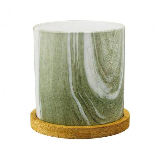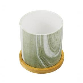 Vasinho de porcelana formato cilíndrico com 9.5 x 9 x 9 cm de dimensão na cor verde com estilo que relembra mármore e vem com base de bambu. Pode colocar plantinha no vaso. Material: porcelana