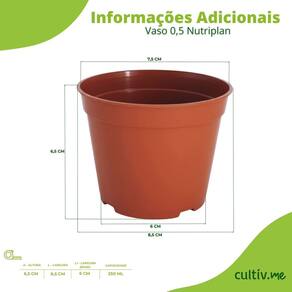 Descrição * O Vaso 0,5 NutriPlan é ideal para o cultivo inicial de plantas, mudas, sementes e pequenas suculentas. * Compacto, leve e funcional, é perfeito para quem busca praticidade no dia a dia da jardinagem, seja em casa, hortas urbanas, estufas ou viveiros. * Fabricado em plástico resistente, proporciona boa durabilidade e conta com base adequada para drenagem * Ajudando a evitar o acúmulo excessivo de água e favorecendo o desenvolvimento saudável das raízes.