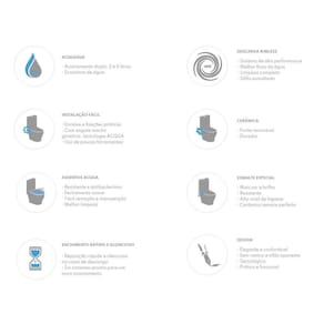 Com design inovador, esta bacia sanitária reúne tecnologia e elegância: conta com esmalte especial de alto brilho, sistema de acionamento duplo, descarga rimless, enchimento da caixa rápido e silencioso, além de assento antibacteriano com fechamento suave.