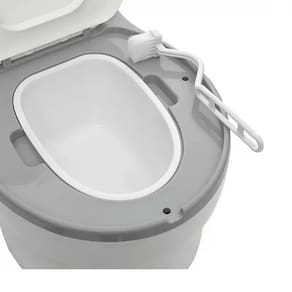 Possui um botão que emite som de descarga, tampa acoplada e assento com design à prova de respingos.