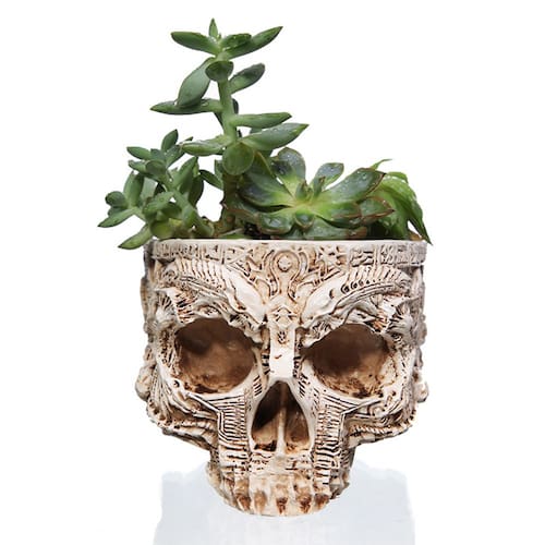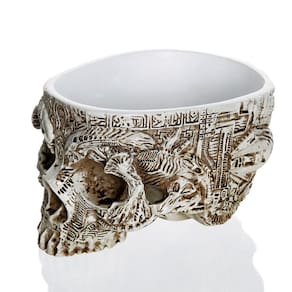 Material: Resina Peso: 409 g Tamanho: 16x11x13 cm Design intrincado de caveira esculpida — Vaso de flores exclusivo com esculturas esqueléticas detalhadas, perfeito para decoração gótica e artística. Construção durável em resina — Feita de resina premium, leve, porém resistente, resistente ao desbotamento e rachaduras, garantindo o uso a longo prazo. Perfeito para suculentas e plantas pequenas — Vaso compacto ideal para suculentas, ervas, cactos ou flores, realçando a vegetação com estilo criativo. Acento decorativo versátil — adequado para desktops, varandas, pátios, jardins ou festas de Halloween, combinando charme assustador com praticidade. Dimensões do produto — mede 16x11x13cm, pesa 409g; o tamanho portátil facilita a colocação em mesas, parapeitos de janelas ou prateleiras para decoração.