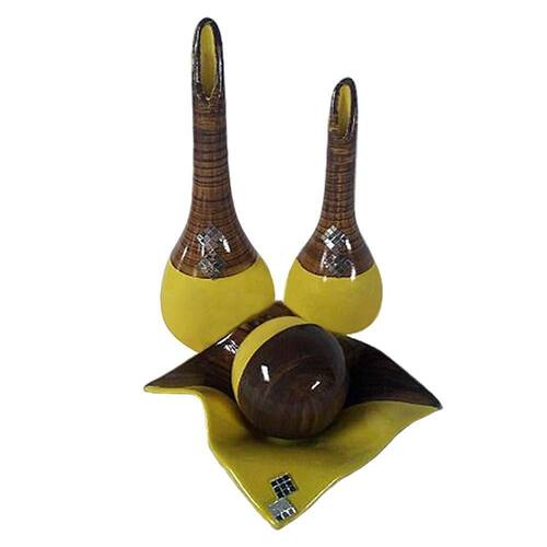 Jogo de vasos par lâmpadas e centro de mesa em cerâmica - amarelo Jogo de vasos par de lâmpadas e centro de mesa 1 de sala e aparador decor Jogo de vasos par de lâmpadas e centro de mesa 1 premium em cerâmica ecológica decorativa de alta qualidade e durabilidade com acabamento diferenciado, inspirador e moderno. O produto em cerâmica é uma belíssima peça atemporal, sendo ótimo para entusiastas e profissionais da decoração, pois garante charme, elegância, modernidade e sofisticação. Repagine e decore a sua casa, cozinha, sala de jantar, sala de estar, aparadores e mesas em gerais, deixando-as com um clima agradável, alegre e descontraído, sendo também uma ótima opção de presente. Dimensões: - centro de mesa 1 : largura: 20 cm x diâmetro: 12 cm - lâmpada grande: altura: 32 cm x largura: 7 cm. - lâmpada média: altura: 28 cm x largura: 6 cm. Características do produto: - centro de mesa 1 e par de lâmpadas em cerâmica de alta qualidade e durabilidade - pintura artesanal. - produzido por artesões profissionais seguindo um padrão de qualidade que atenda o gosto dos nossos clientes Cuidados: - recomendamos o uso de pano levemente umedecido para sua limpeza. do produto: - o produto é muito bem acomodado dentro da caixa, e super embalado para evitar quebras, ainda assim possuímos um sistema de e troca. Imagens meramente ilustrativas - produto artesanal, podendo variar de cor e/ou tonalidade Marca: Não Informado