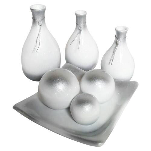 Jogo de vasos trio garrafas e centro de mesa 3 decor - white silver Jogo de vasos trio garrafas e centro de mesa 3 em cerâmica premium decor Jogo de vasos trio garrafas e centro de mesa com 3 premium em cerâmica decorativa de alta qualidade e durabilidade com acabamento diferenciado, inspirador e moderno. O produto em cerâmica é uma belíssima peça atemporal, sendo ótimo para entusiastas e profissionais da decoração, pois garante charme, elegância, modernidade e sofisticação. Repagine e decore a sua casa, cozinha, sala de jantar, sala de estar, aparadores e mesas em gerais, deixando-as com um clima agradável, alegre e descontraído, sendo também uma ótima opção de presente. Dimensões: - centro de mesa 3 : altura: 12 cm x largura: 20 cm x comprimento: 20 cm. - vaso grande: altura: 18 cm x largura: 7 cm. - vaso médio: altura: 16 cm x largura: 6 cm. - vaso pequeno: altura: 13,5 cm x largura: 5 cm. Características do produto: - centro de mesa com 3 e trio de garrafas em cerâmica de alta qualidade e durabilidade - pintura artesanal. - produzido por artesões profissionais seguindo um padrão de qualidade que atenda o gosto dos nossos clientes Cuidados: - recomendamos o uso de pano levemente umedecido para sua limpeza. do produto: - o produto é muito bem acomodado dentro da caixa, e super embalado para evitar quebras, ainda assim possuímos um sistema de e troca. Imagens meramente ilustrativas - produto artesanal, podendo variar de cor e/ou tonalidade Marca: Não Informado