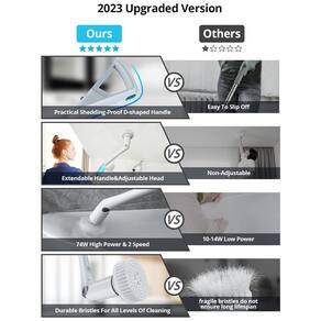 4 cabeças de escova multiuso 4 cabeças de escova rotativas substituíveis adequadas a todas as suas necessidades A escova chata grande é usada para limpar pisos, azulejos e vidros. A escova pontiaguda é usada para limpar o chuveiro, torneiras, frestas e cantos. A escova redonda é usada para limpar rodapés, pias e banheiras. A escova de canto é usada para limpar o cooktop, fogão, forno e rejunte. Deixe esta escova giratória multifuncional salvá lo do banheiro, cozinha e sala de estar, para sair para se divertir mais