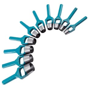 Aço especial. Corpo com acabamento em pintura na cor azul padrão Gedore e região de corte polida. Possui tratamento térmico. Indicado para estampar peças de borracha ou plástico de acordo com o diâmetro específico.