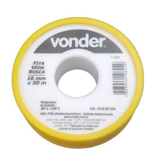 DETALHES TÉCNICOS Largura x comprimento da fita veda rosca: 18 mm x 50 m Cor da fita veda rosca: Branca Material da fita veda rosca: 100% PTFE Politetrafluoretileno Temperatura de trabalho da fita veda rosca: 90 a + 240 c Marca: Não Informado