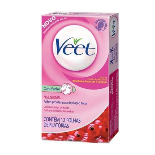 Veet Folhas Depilatórias Facial Normal C/12 DESCRIÇÃO: Folhas para Depilação Facial da Veet é ideal para áreas pequenas e delicadas como o buço. Também muito útil para retoques. Especialmente desenvolvida para Pele Normal e Seca, sua fórmula contém Manteiga de Karité, conhecida pelas suas propriedades hidratantes, e Perfume de Frutas Vermelhas. Depilar em casa nunca foi tão fácil!AÇÃO/ATIVOS: Folhas para Depilação Facial da Veet proporciona a você uma pele macia e suave ao toque como parte da sua rotina de beleza. Possui uma borda arredondada que foi especialmente desenvolvida para ajudar você a ter uma pele macia por até quatro semanas em um único e simples movimento. Veet Cera Fria Facial é eficaz até mesmo em pelos curtos (a partir de 1,5mm) e você não precisa mais esperar os pelos crescerem para ir ao salão.MODO DE USAR: Esfregue a folha dupla entre suas mãos para aquecer a cera. Segure a borda arredondada da Folha EasyGrip e separe as folhas lentamente com as mãos. Dobre uma das folhas ao meio, unindo a parte que contém a cera para uso posterior. Aplique a outra folha suavemente sobre a área a ser depiladas, com a borda arredondada da folha EasyGrip na direção do crescimento dos pelos. Alise a folha com a mão, no mesmo sentido por alguns segundos a fim de garantir uma aderência perfeita. Mantenha a pele da região a ser depilada bem esticada com uma das mãos. Com a outra mão, segurando a borda arredondada da folha EasyGrip, retire a folha rapidamente com um firme e único movimento no sentido contrário ao do crescimento dos pelos, sempre puxando a folha paralelamente e tão próximo da pele quanto possível.ESTE ANÚNCIO CONTÉM: 01 Veet Folhas Depilatórias Facial Normal C/12Veet Folhas DepilatÃrias Facial Normal C/12