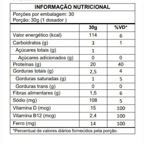 Proteína concentrada de ervilha, proteína concentrada de arroz, aroma sintético idêntico ao natural, espessante goma xantana e edulcorante sucralose.