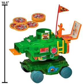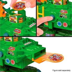 O veículo possui um design robusto e colorido, com as cores verde e laranja predominando, representando as tartarugas e a famosa pizza. A estrutura é inspirada no estilo urbano de Nova York, com detalhes que lembram o espírito aventureiro das Tartarugas Ninja. Ele tem rodas grandes e resistentes, permitindo que as crianças se movam facilmente pelo chão. O grande atrativo do brinquedo é o lançador de pizza , localizado na frente do veiculo. Além do lançador de pizza, o veículo tem um compartimento para armazenar as pizzas extras, permitindo que as crianças recarreguem o lançador durante a diversão. A estética do brinquedo é focada nas características das Tartarugas Ninja, com detalhes gráficos como o emblema da equipe e elementos que lembram o ambiente construído onde eles habitam. O Veículo Lançador de Pizza das Tartarugas Ninja é perfeito para quem ama a série e quer recriar os momentos de ação com uma brincadeira simples, porém cheia de diversão. A principal diversão está em lançar as pizzas e desafiar os amigos em uma batalha de disparos.