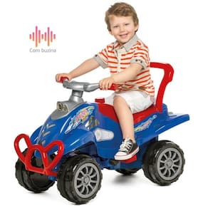Além do aro protetor e apoio de pés, o Cross Calesita tem rodas com borracha para não derrapar, buzina e o assento levanta para guardar brinquedos!