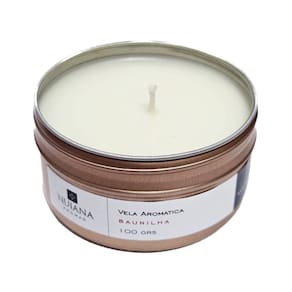 Características: Vela aromática Produto vegano Não testado em animais Pavio natural feito em 100% algodão Diâmetro: 7cm Embalagem: lata de alumínio Tamanho da lata: 4cm x 7cm Peso: 100g Material base da vela: cera de coco Duração aproximada: 30h Produto artesanal Produzido no Brasil Validade: 02 anos