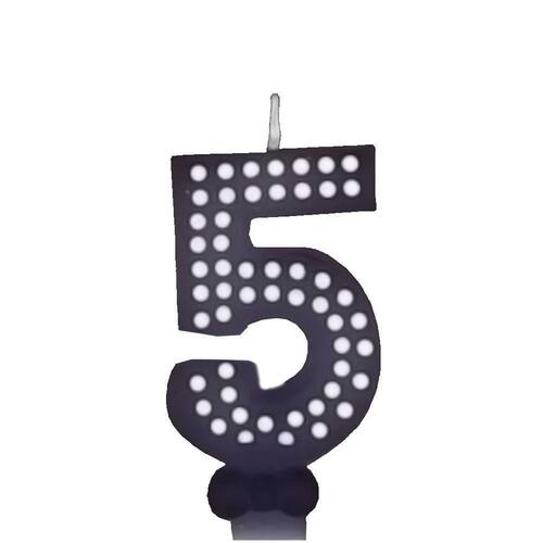 Vela de Aniversário Preto com Branco N5 - Extra FestasVela de Aniversário Poá Preto N5 é feita de parafina, com cores fortes, perfeita para deixar sua decoração e seu bolo ainda mais bonito e divertido! Contando com o formato do número 5, a vela ainda apaga e acende!