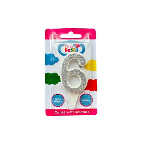 Vela Estilosa Prata Nº6 Cia da Festa. Celebre cada comemoração com um toque mais sofisticado usando a vela Estilosa! Disponível em números que brilham com glitter, esta vela realça qualquer bolo com seu design elegante e cor chamativa. Seu pavio especial cria o efeito de estrelinhas (faíscas) e tem a magia de se reacender ao ser assoprado. Surpreenda seus convidados com um espetáculo de luz e brilho em cada aniversário, tornando seus momentos especiais ainda mais memoráveis com a vela Estilosa da Cia da Festa!