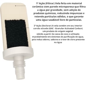 Feito de material cerâmico microporoso que filtra a água por gravidade, sem adição de produtos químicos, reduzindo impurezas e retendo partículas sólidas, proporcionando uma água saudável e livre de microorganismos. A vela contém em seu interior carvão ativado (GAC - Granular Activated Carbon), um produto de origem vegetal obtido a partir da casca do coco e utilizado mundialmente em sistemas de purificação de água, pois reduz odores, sabores e o teor de cloro presente na água.Bica móvel
