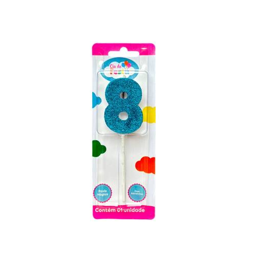 Vela Glamour Azul Nº8 Cia da Festa. Celebre cada comemoração com um toque de elegância usando a vela Glamour! Disponível em números que brilham intensamente com glitter, esta vela realça qualquer bolo com seu brilho encantador. Equipada com um palito longo para fácil fixação, seu pavio especial cria o efeito de estrelinhas (faíscas) e tem a magia de se reacender ao ser assoprado. Surpreenda seus convidados com um espetáculo de luz e brilho em cada aniversário, tornando seus momentos especiais ainda mais memoráveis com a vela Glamour da Cia da Festa!