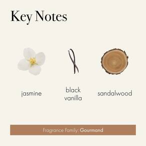 PERFUME — A baunilha preta âmbar apresenta laranja, framboesa e cravo picante que evoluem para uma mistura elaborada de jasmim puro e cassis. Baunilha preta, âmbar e sândalo criam um fundo quente para esse perfume acolhedor.