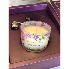 Na collab Dani Fernandes & Bridgerton, da Netflix e Shondaland, a vela perfumada leva o aroma delicado de Peônias & Chás para a casa, enquanto o apagador metálico finaliza o momento com cuidado: preserva o perfume no ambiente e ajuda a evitar fumaça excessiva