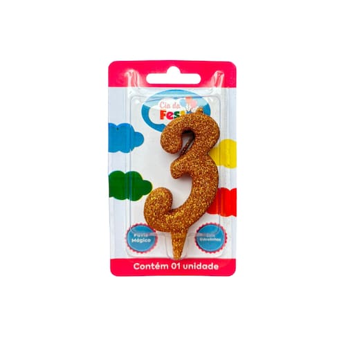 Vela Premium Glitter Ouro Nº3 Cia da Festa. Celebre cada comemoração com um toque mais sofisticado usando a vela Premium! Disponível em números que brilham intensamente com glitter, esta vela realça qualquer bolo com seu design e cor chamativos. Seu pavio especial cria o efeito de estrelinhas (faíscas) e tem a magia de se reacender ao ser assoprado. Surpreenda seus convidados com um espetáculo de luz e brilho em cada aniversário, tornando seus momentos especiais ainda mais memoráveis com a vela Premium da Cia da Festa!