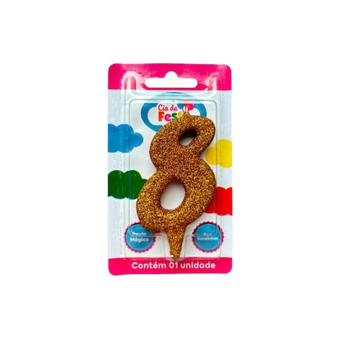 Vela Premium Glitter Ouro Nº8 Cia da Festa. Celebre cada comemoração com um toque mais sofisticado usando a vela Premium! Disponível em números que brilham intensamente com glitter, esta vela realça qualquer bolo com seu design e cor chamativos. Seu pavio especial cria o efeito de estrelinhas (faíscas) e tem a magia de se reacender ao ser assoprado. Surpreenda seus convidados com um espetáculo de luz e brilho em cada aniversário, tornando seus momentos especiais ainda mais memoráveis com a vela Premium da Cia da Festa!