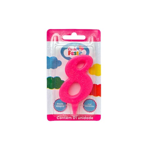 Vela Premium Rosa Nº8 Cia da Festa. Celebre cada comemoração com um toque mais sofisticado usando a vela Premium! Disponível em números que brilham com glitter, esta vela realça qualquer bolo com seu design chamativo. Seu pavio especial cria o efeito de estrelinhas (faíscas) e tem a magia de se reacender ao ser assoprado. Surpreenda seus convidados com um espetáculo de luz e brilho em cada aniversário, tornando seus momentos especiais ainda mais memoráveis com a vela Premium da Cia da Festa!