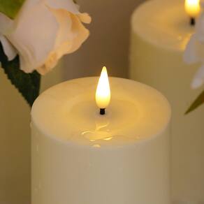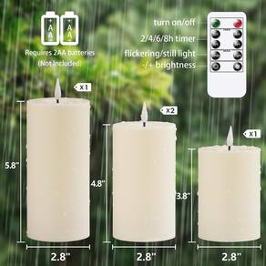 Zevanor Informações das velas de pilar LED: O que você recebe: 4 velas de LED à prova d'água, 1 manual, 1 controle remoto Tamanho da vela: 9,7 cm 12,2 cm 12,2 cm 14,7 cm A x 2,20 cm P Cores da vela: marfim Feito de: plástico Pavio de vela: pavio em gota Cor do pavio: Luz quente Característica especial: impermeável, sem chama, modo vela, temporizador de ciclo de 24 horas, aumento/diminui o brilho - Velas impermeáveis: a parte inferior das velas LED é projetada com uma base impermeável rosqueada e uma junta de vedação para proteger a bateria e os componentes da corrosão da água - Velas de LED em 3 tamanhos: as pequenas velas à prova d'água sem chama (7,1 cm x 9,7 cm 12,2 cm 12,2 cm 14,7 cm) são feitas de plástico impermeável espesso que se encaixa na maioria das varandas, piscinas e pátios. Excelente desempenho à prova d'água permite que as velas LED funcionem bem ao ar livre, mesmo em dias chuvosos - Controle remoto inteligente de 10 teclas: o pacote de velas sem chama inclui um controle remoto multifuncional, você pode controlar facilmente as velas de led on/off, temporizador de 2/4/6/8 horas (ciclo diário), cintilação/não cintilação e nível de brilho através do controle remoto - Longas horas de funcionamento: Você ainda está lutando para trocar as baterias das velas operadas a bateria com frequência? Estas velas de pilar sem chama duram cerca de 800 horas quando alimentadas por 2 pilhas AA (com base na bateria de 1100 mAh, não incluídas) - Informações da embalagem: você receberá quatro velas LED à prova d'água, um controle remoto inteligente e um manual de instruções. Caixas de embalagem espessas e sacos plásticos de bolhas garantem que as velas sejam entregues intactas