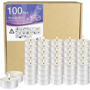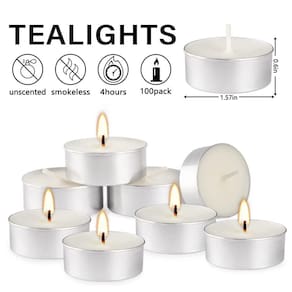 - Tamanho: cada vela Tea Light mede 1,5 polegadas L x 0,65 polegadas H e queima por quatro horas sem fumaça preta ou confusão ca pelo gotejamento de velas
