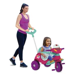 O Velobaby Passeio & Pedal é prático e divertido, oferecendo duas formas de uso: no modo passeio, o adulto conduz com a haste direcionável, e no modo pedal, a criança pode pedalar livremente. A transição entre as funções é simples: basta remover a haste, o cercado de proteção e o apoio para os pés. Assento ergonômico. Chip sonoro com luz de LED. Suporte para garrafa d’água, mamadeira ou squeeze. Haste removível com suporte para bolsa/ sacola. Apoios removíveis mantêm os pés da criança apoiados confortavelmente. Rodas com anel antiderrapante. Dispositivo de roda livre. Cercado de proteção removível. Painel de atividades (no cercado). Peso máximo suportado: 30 kg. Idade sugerida: + 12 meses.